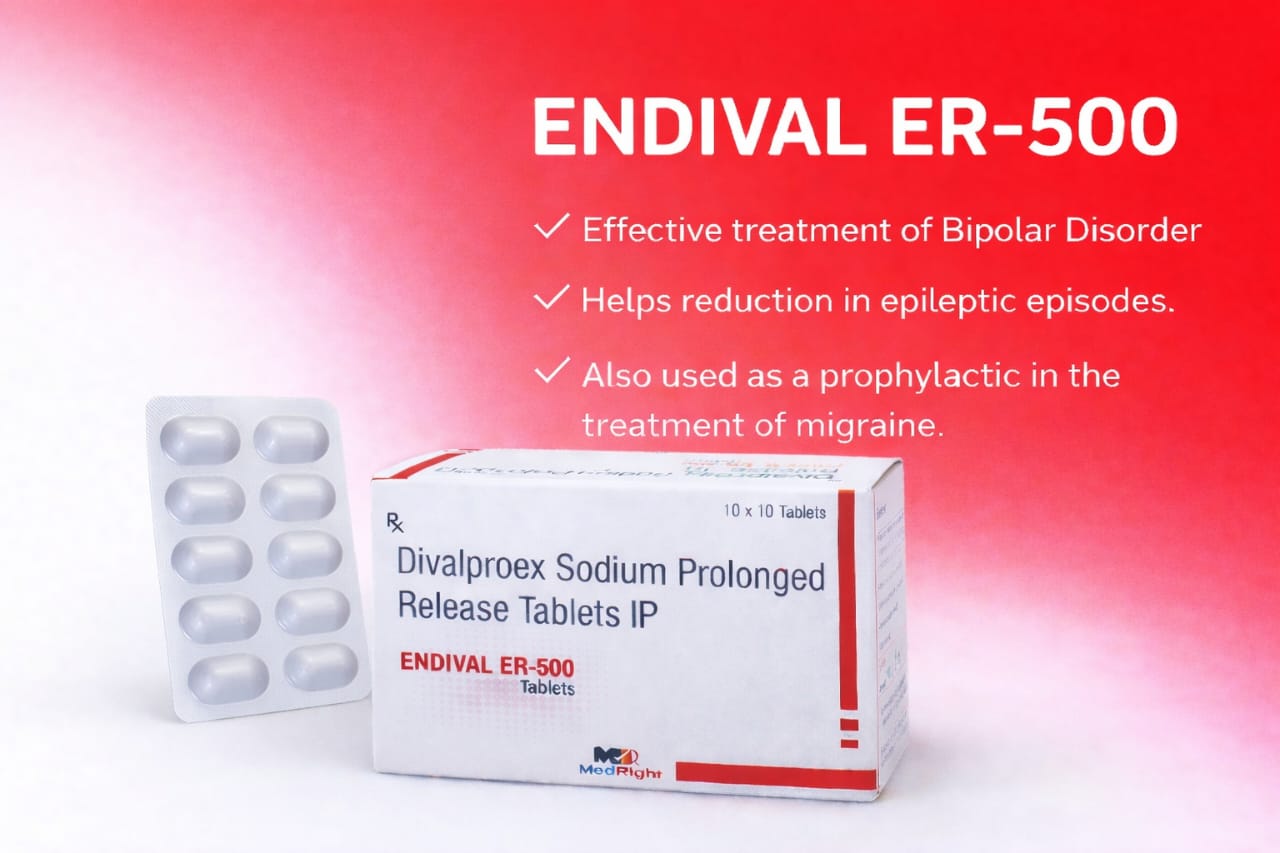 Endival ER 500 mg is an *extended-release formulation of divalproex sodium, indicated for the management of **epilepsy, bipolar disorder, and migraine prophylaxis. The ER formulation ensures **sustained plasma levels, improved tolerability, and *once-daily dosing, thereby enhancing patient compliance and therapeutic outcomes.