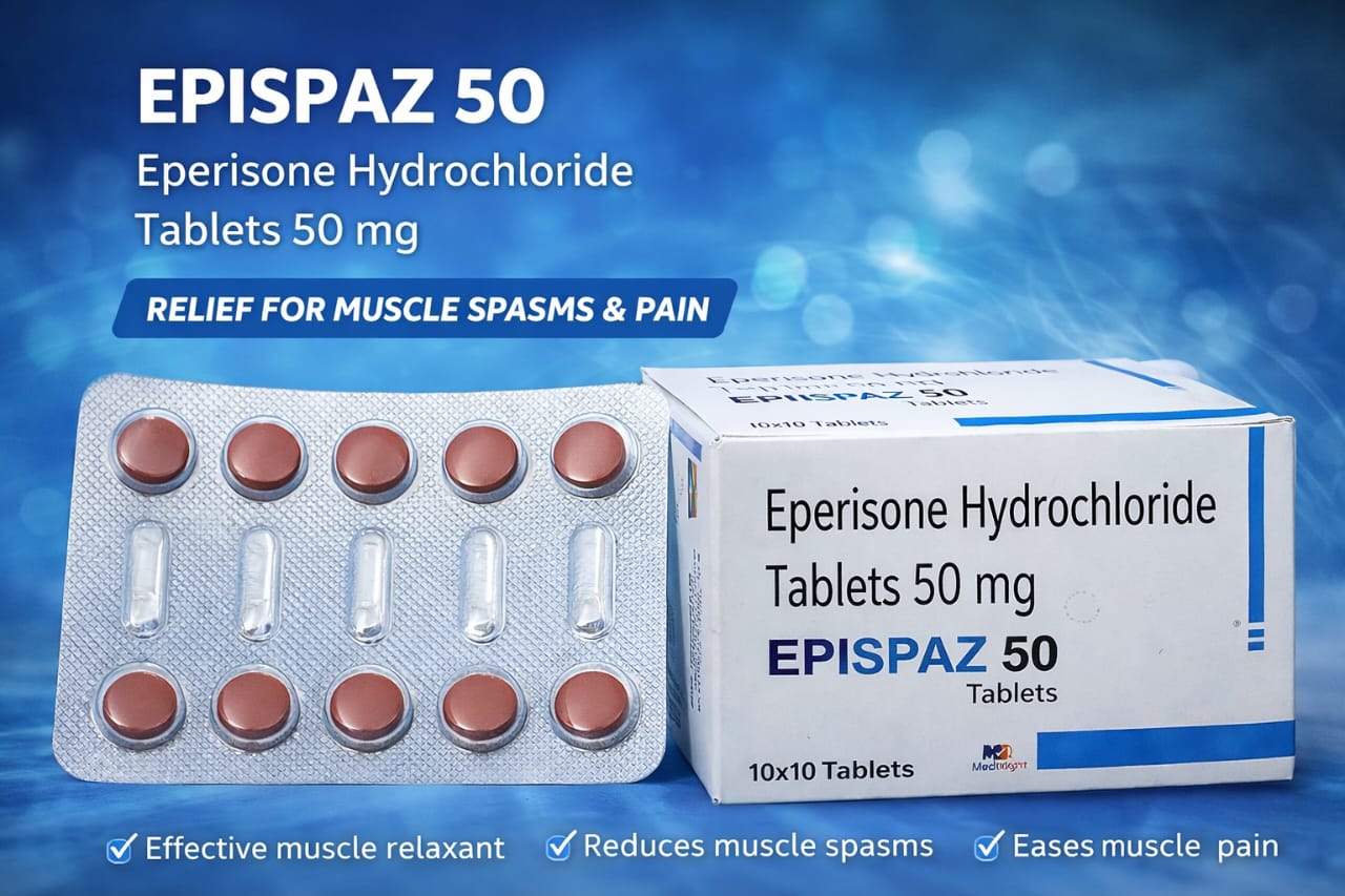 Epispaz 50 mg Tablet is a centrally acting muscle relaxant used to relieve muscle stiffness, spasm, and associated pain. It works by improving blood circulation in the muscles and reducing excessive muscle tension, helping restore normal muscle movement and comfort.